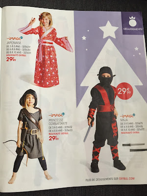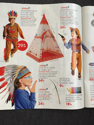 Quelle surprise ! En effet les déguisements d’indiens et de cow-boys, mais aussi de princesses japonaises par exemple sont des classiques en France ! Un de mes fils adore d’ailleurs les costumes d’indien (pour leurs couleurs chatoyantes et aussi parce qu’il adore s’imaginer en chef indien) et nous avons donc plusieurs costumes indiens. D’ailleurs le catalogue de ce magasin de jouet où nous avons acheté les déguisements (tout comme les autres enseignes) les expose clairement. Je n’aurais jamais pensé que cela pouvait être offensant !